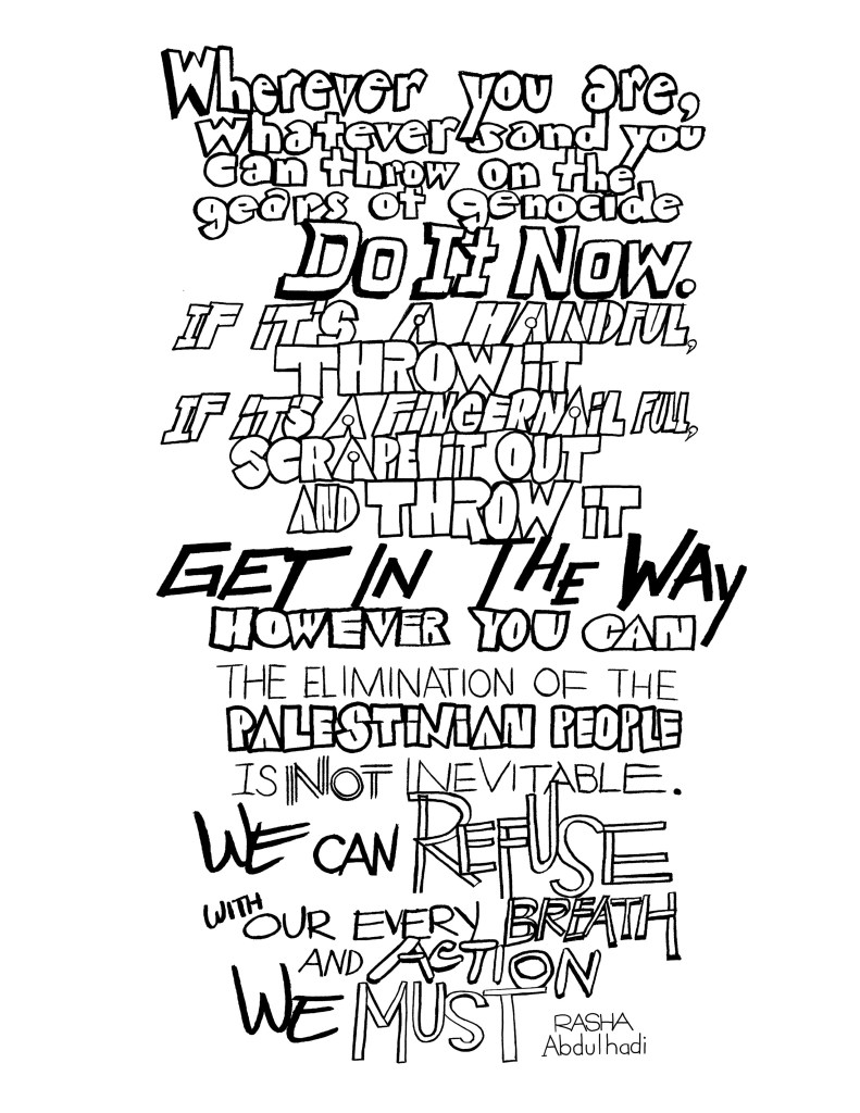 When Rasha Abdulhadi calls on us to get in the way, I consider too the importance of getting out of our own way: materially and literally, none of us are powerless. Students setting up encampments at universities around the world, prisoners donating their week of wages in solidarity with Palestinians, principled people blocking railways and weapons manufacturing, writers demanding that literary awards are not direct participants in genocide and dropping their book from such awards, mutual aid and fundraising projects like Gaza Funds, Workshops4Gaza, the Refaat Mobile Library, Palestine Asdiqa, Operation Olive Branch, and so on: we all have a role to play.