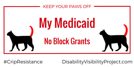 Image description: graphic with a white background. A thin red line borders the rectangular graphic. Centered in red text reads, “Keep Your Paws Off My Medicaid. No Block Grants. ” On both sides of the text is an illustration of a black cat at profile with a red tail. On the lower left corner in black text: #CripTheResistance. On the lower right corner in black text: DisabilityVisibilityProject.com